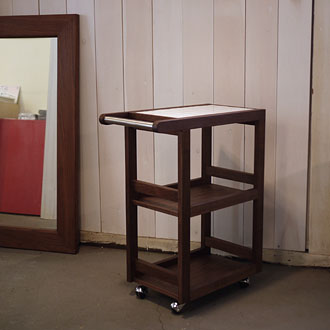 ウォールナット材で小さなキッチンワゴンをつくりました。新宿オゾンで行われている、料理研究家ワタナベマキさんの理想のキッチンの展示会場にて、ご覧いただけます。天板はタイル張りで、熱いものをそのまま置くことができて、トレイとしても使用することができます。